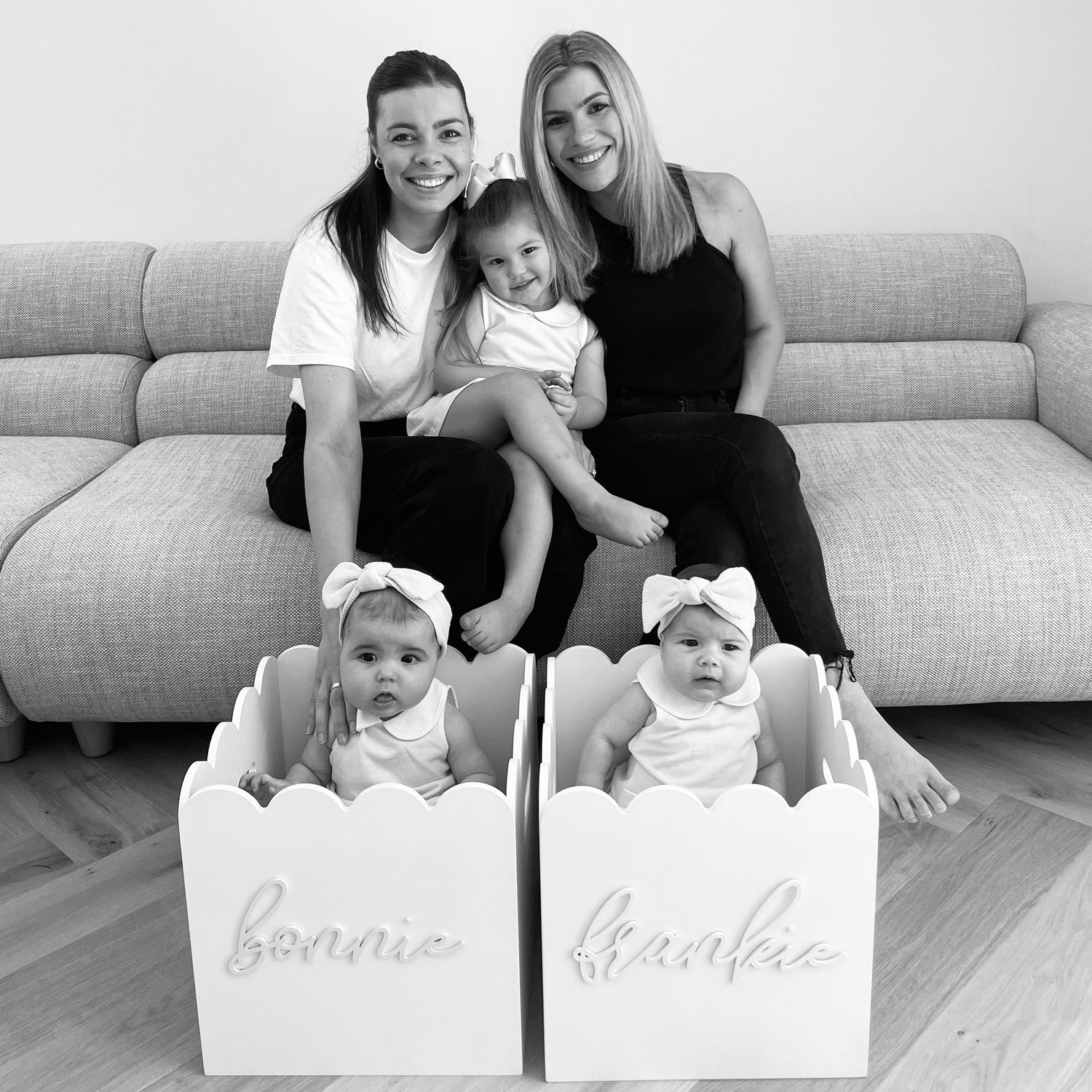 Hi there! We're Aimee & Holly, sisters and proud mums behind Frankie Meets Bonnie. Meet our beautiful girls; Teddy, Aimee's eldest and our five month old girls Frankie & Bonnie, born just 1.5 weeks apart. Our love for interior design inspired us to create a toy box that's not just functional but also adds a touch of style to any space. We can't wait to see our toy boxes in your homes!