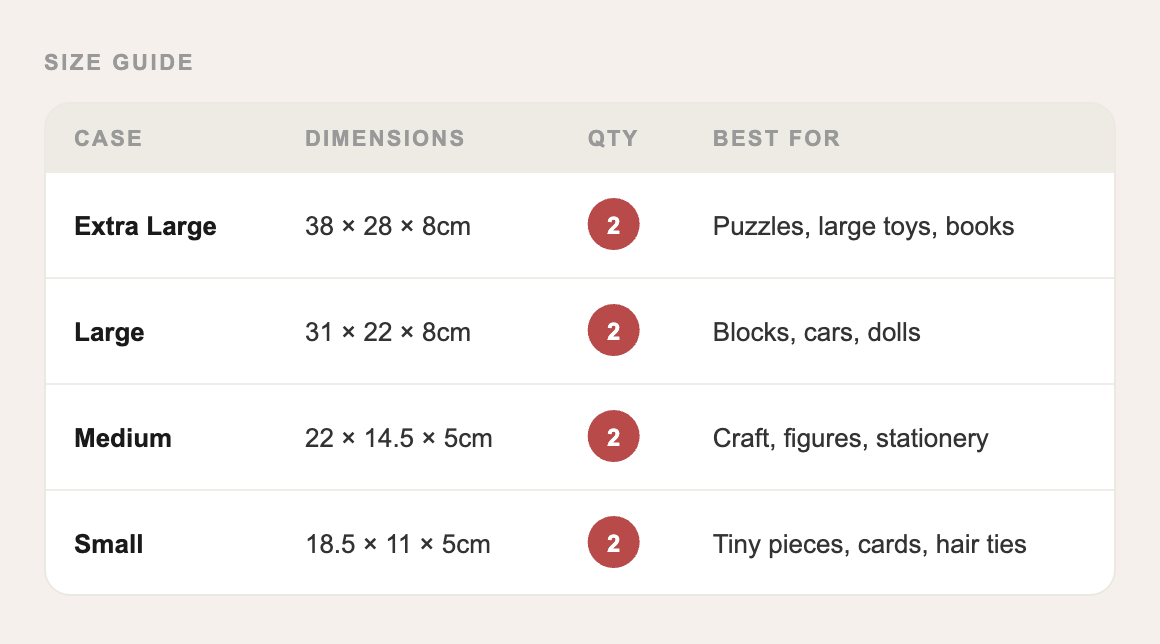 Eight stackable cases across four sizes — everything you need to bring order to the toy room, nursery, or playspace. Stack them, nest them, label them. Total organisation, finally sorted.